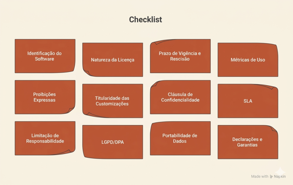 Regra prática: nunca use os termos como ‘venda’, ‘transferência’ ou ‘entrega do software’ em contratos onde a intenção é apenas licenciar. Cada palavra importa.