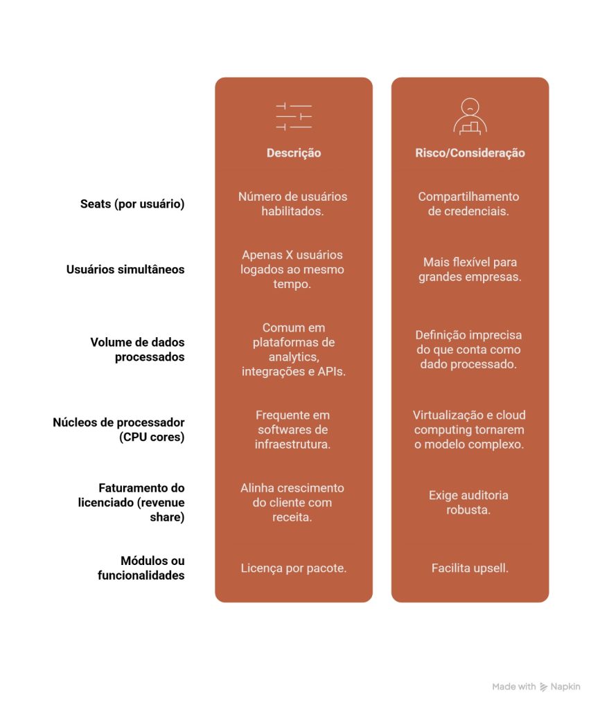 A métrica de licença define como a precificação escala com o uso do cliente. Errá-la é perder receita de forma silenciosa. As principais métricas utilizadas no mercado brasileiro de software: